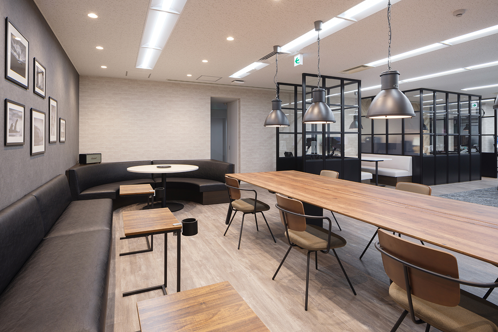 ランチや社内イベントに使えるスペースです。リラックスしながら会話や休憩を楽しめます。110インチの巨大プロジェクターも設置しています!